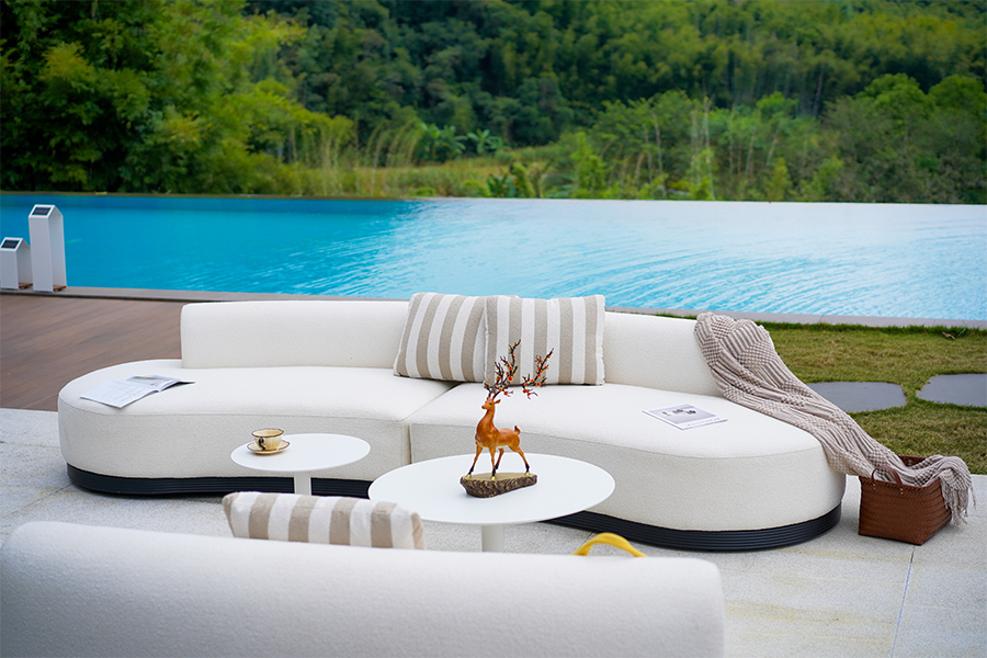 M&X outdoor leisure sofa, smooth curve combination, like a jumping note, armrest extension arc like a dancer's flowing skirt, embedded in the sofa, as if lying in the arms of lovers, the slender elegance of the vertebral feet, is borrowed from the ballet dancer's light footsteps, with the same curve combination of the coffee table, plus customized ceramic foot covers, so that the whole yard is full of luxury.