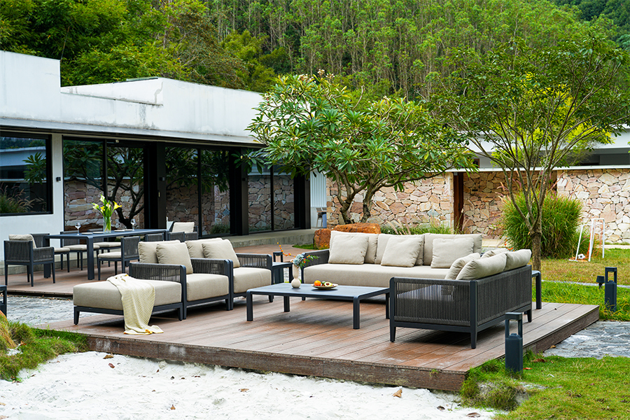 R series outdoor leisure sofa, elegant shape, like a capital English letter "R", terrazzo desktop integration, so that the whole sofa has a combination of Chinese and Western elements, exquisite appearance is simple but not simple, the so-called sense of ceremony, not in the café posing, but exquisite to the details of life.