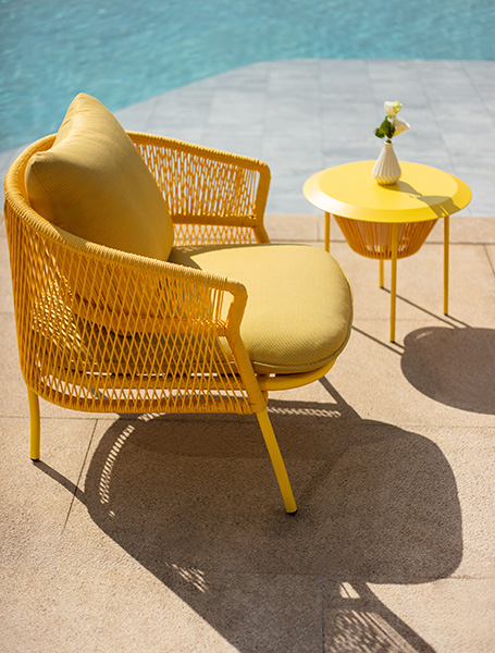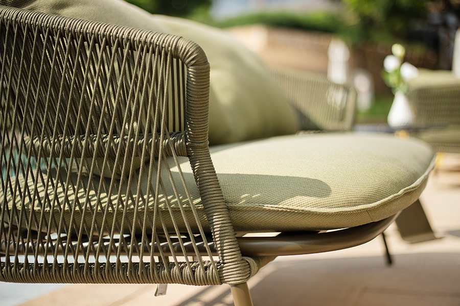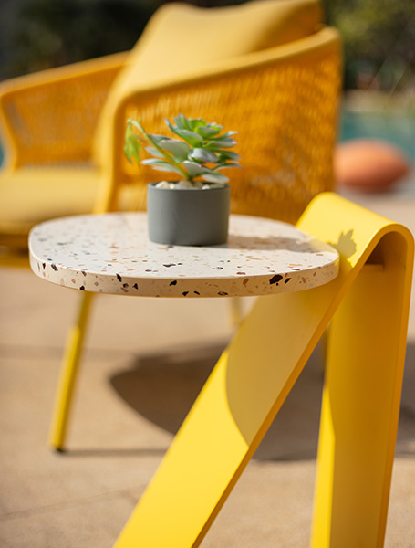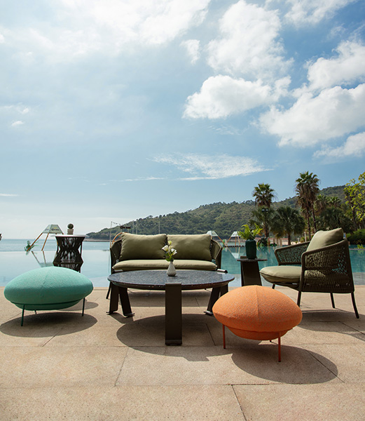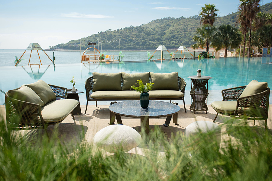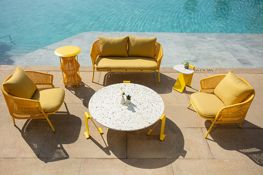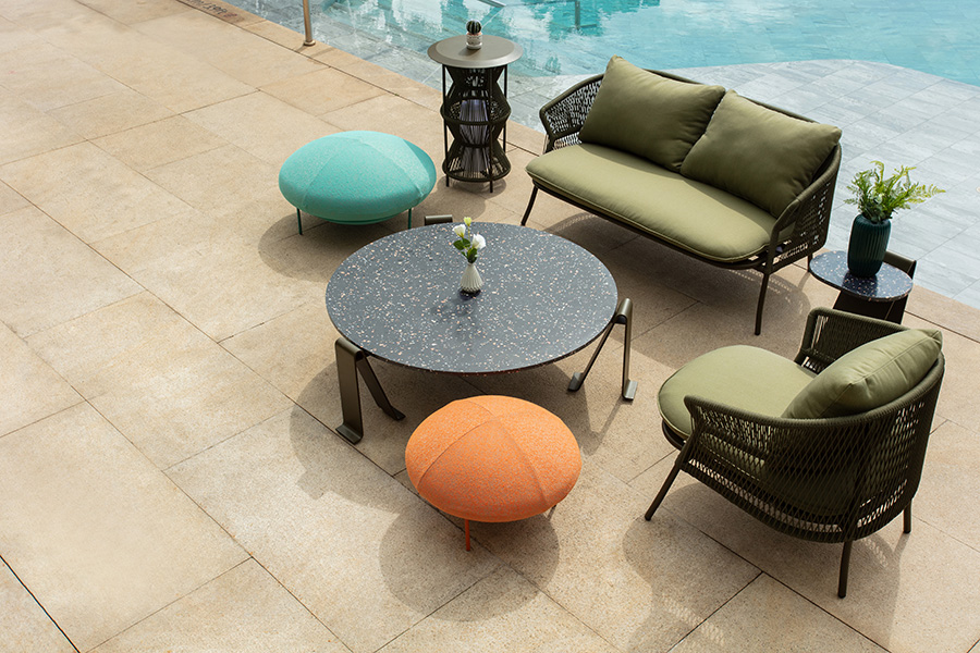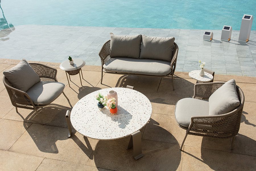 R series outdoor leisure sofa, elegant shape, like a capital English letter "R", terrazzo desktop integration, so that the whole sofa has a combination of Chinese and Western elements, exquisite appearance is simple but not simple, the so-called sense of ceremony, not in the café posing, but exquisite to the details of life.